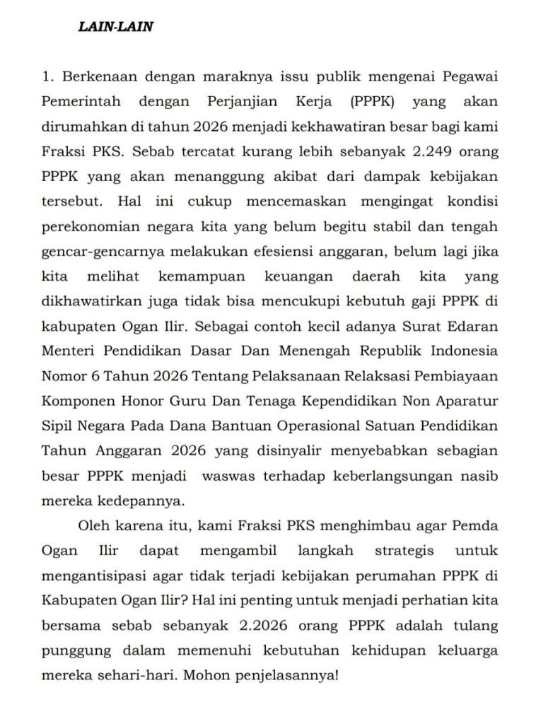 3. Kami Fraksi PKS juga menanggapi maraknya issu publik mengenai Pegawai Perjanjian Kerja (PPPK) Pemerintah yang akan dirumahkan di tahun 2026 menjadi kekhawatiran besar bagi kami Fraksi PKS. Sebab tercatat kurang lebih sebanyak 2.249 orang PPPK yang akan menanggung akibat dari dampak kebijakan tersebut. Hal ini cukup mencemaskan kami Fraksi PKS, mengingat kondisi perekonomian negara kita yang belum begitu stabil dan tengah gencar-gencarnya melakukan efesiensi anggaran, belum lagi jika melihat kemampuan keuangan daerah kita, dikhawatirkan juga tidak bisa mencukupi kebutuh gaji PPPK di kabupaten Ogan Ilir. Sebagai contoh kecil adanya Surat Edaran Menteri Pendidikan Dasar Dan Menengah Republik Indonesia Nomor 6 Tahun 2026 Tentang Pelaksanaan Relaksasi Pembiayaan Komponen Honor Guru Dan Tenaga Kependidikan Non Aparatur Sipil Negara Pada Dana Bantuan Operasional Satuan Pendidikan Tahun Anggaran 2026 yang disinyalir menyebabkan sebagian besar PPPK menjadi waswas terhadap keberlangsungan nasib mereka kedepannya. Oleh karena itu, kami Fraksi PKS menghimbau agar Pemda Ogan Ilir dapat mengambil langkah strategis srtategis untuk mengantisipasi agar tidak terjadi kebijakan perumahan PPPK di Kabupaten Ogan Ilir? Hal ini penting untuk menjadi perhatian kita bersama sebab sebanyak 2.2026 orang PPPK adalah tulang punggung dalam memenuhi kebutuhan kehidupan keluarga mereka sehari-hari.