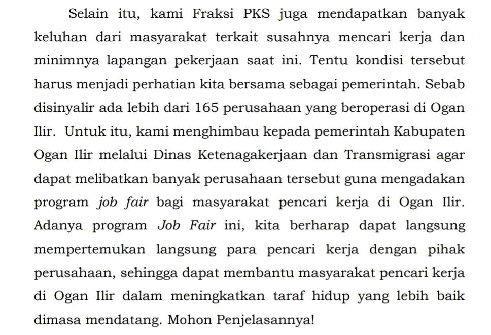 minimnya lapangan pekerjaan saat ini. Tentu kondisi tersebut harus menjadi perhatian kita bersama sebagai pemerintah. Sebab disinyalir ada lebih dari 165 perusahaan yang beroperasi di Ogan Ilir. Untuk itu, kami menghimbau kepada pemerintah Kabupaten Ogan Ilir melalui Dinas Ketenagakerjaan dan Transmigrasi agar dapat melibatkan banyak perusahaan tersebut guna mengadakan program job fair bagi masyarakat pencari kerja di Ogan Ilir. Adanya program Job Fair ini, kita berharap dapat langsung mempertemukan langsung para pencari kerja dengan pihak perusahaan, sehingga dapat membantu masyarakat pencari kerja di Ogan Ilir dalam meningkatkan taraf hidup yang lebih baik dimasa mendatang.